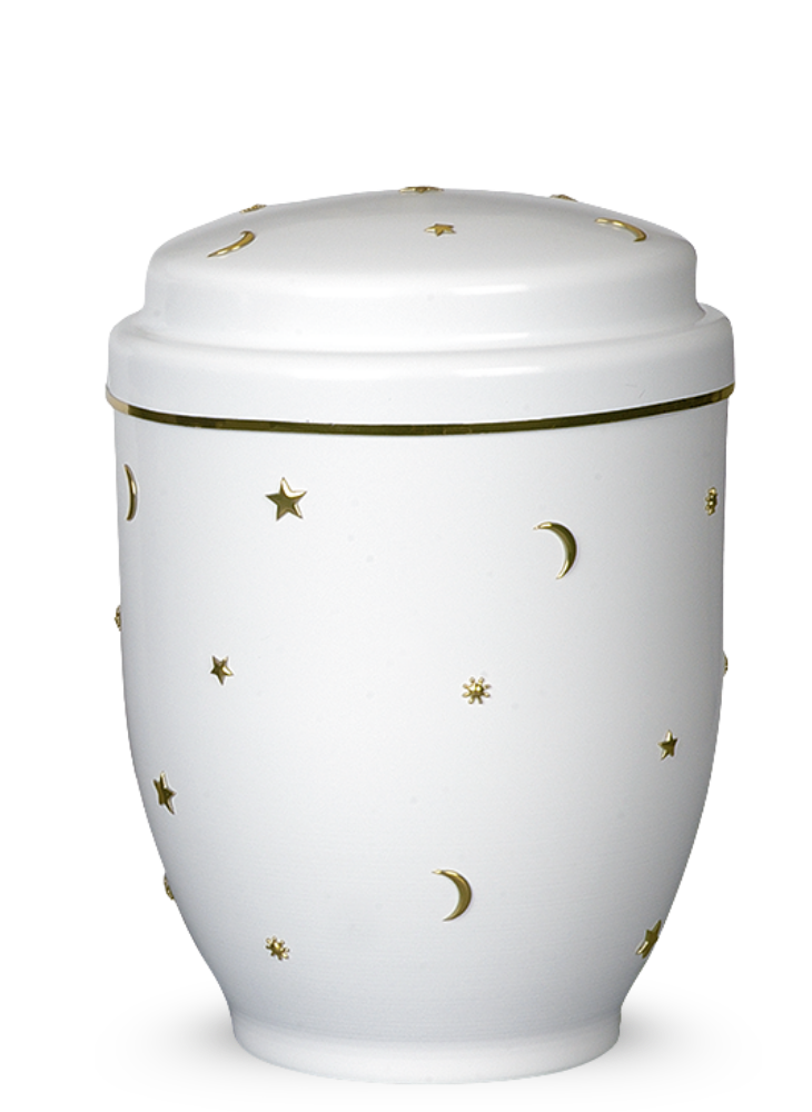 ma niebieską powierzchnię z wyrazistym zdobieniem nocnego nieba i złotym paskiem wokół pokrywki. Ta urna jest bardzo delikatna i subtelna.