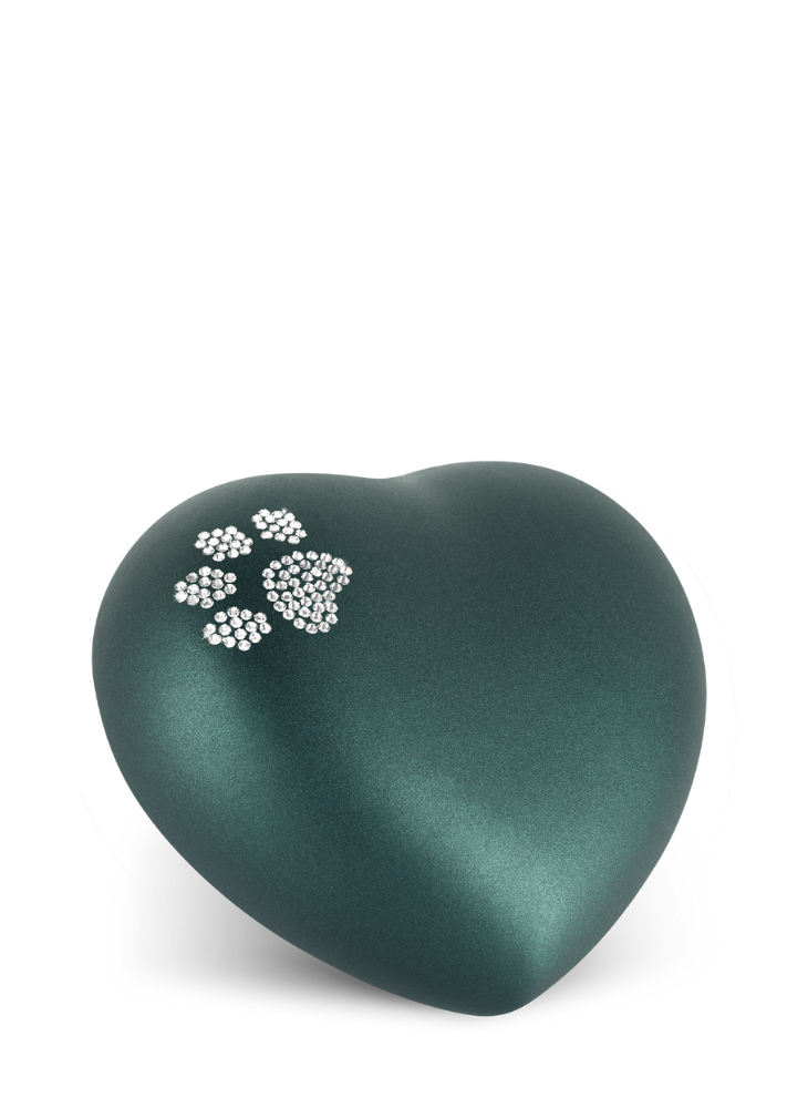 má sametový, třpytivý povrch v hnědé barvě a je ve tvaru srdce. Je ručně zdobená krásnými kamínky Swarovski ve tvaru tlapky. Urna je vhodná na popel zvířátka do 10kg.
