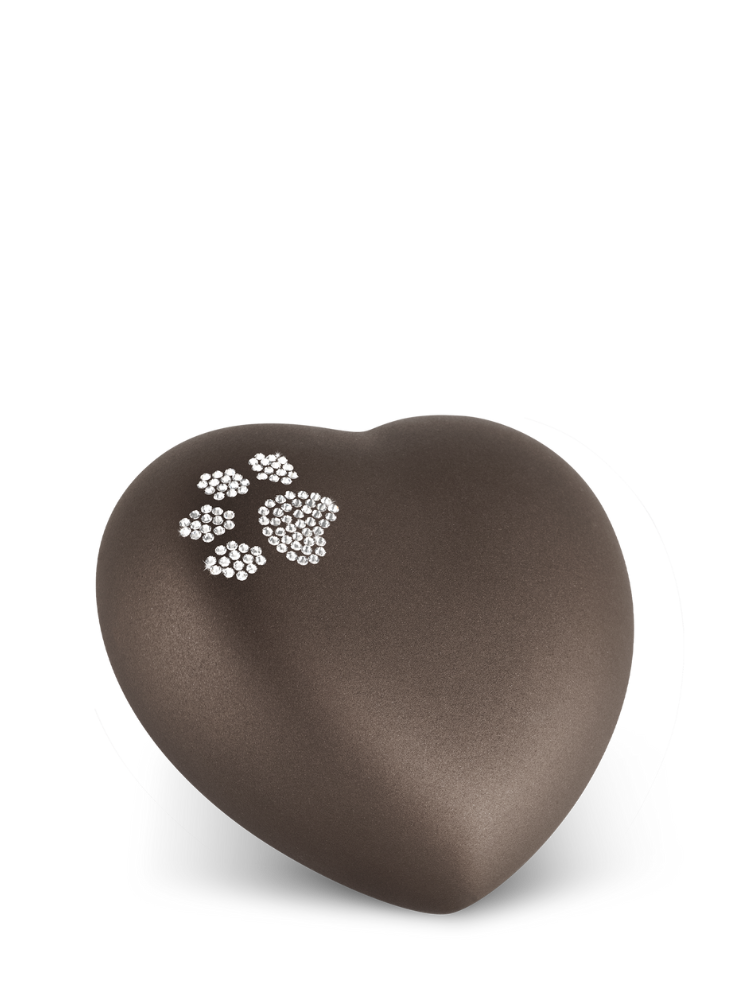 Keramická urna Herz Paw má sametový, třpytivý povrch v hnědé barvě a je ve tvaru srdce. Je ručně zdobená krásnými kamínky Swarovski ve tvaru tlapky.